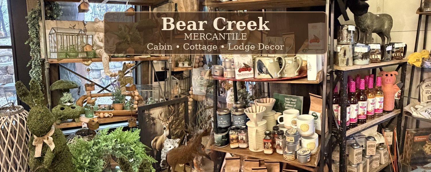 Bear Creek Cabin • Cottage • Lodge Decoris located just north of Branson in the heart of the Ozarks. We specialize in unique, nature-inspired furnishings that reflect the beauty of Table Rock Lake and the surrounding mountains.